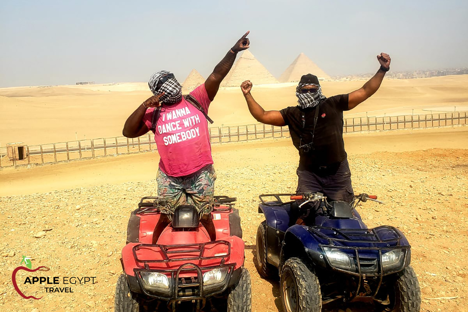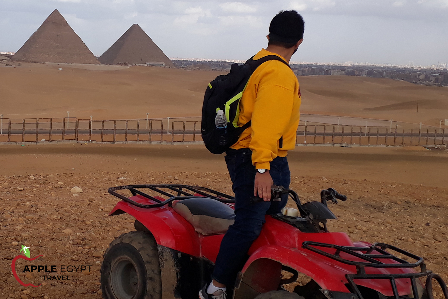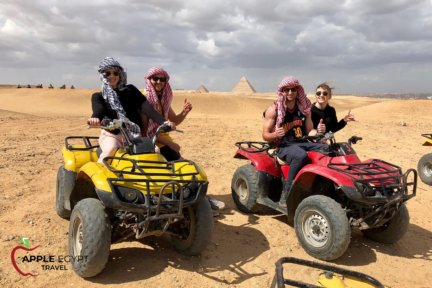 As Per Requested time at any time between (6:00 am to 17:00 Pm) Pickup from your hotel in Cairo or Giza by Apple Egypt Travel guide and transfer you to Giza Pyramids and get your ride ready then Start the Quad Bike Tour the Buggy Tour is quite simply the most exciting way to discover all the ancient wonders of Egypt. These custom-made buggies are capable of whisking over the dunes at speeds over 50 mph taking you to places where most tourists never get to see. Riding through the desert is a thrilling experience and will make your Holidays in Egypt unforgettable with Amazing Pictures of you behind the panoramic view of the Pyramids. after the Tour Finish transfer you Back to your hotel.